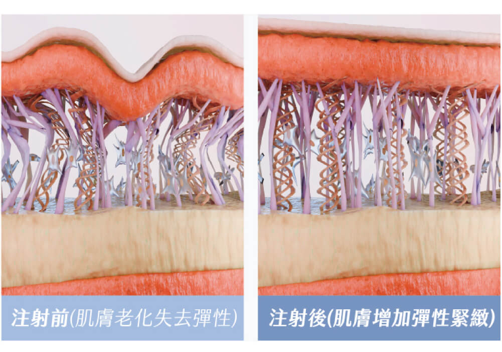 Profhilo 注射後能在真皮與皮下組織廣泛擴散,活化纖維母細胞,促進膠原蛋白與彈力蛋白增生,達到 深層保濕、緊緻拉提、改善膚質 的效果。