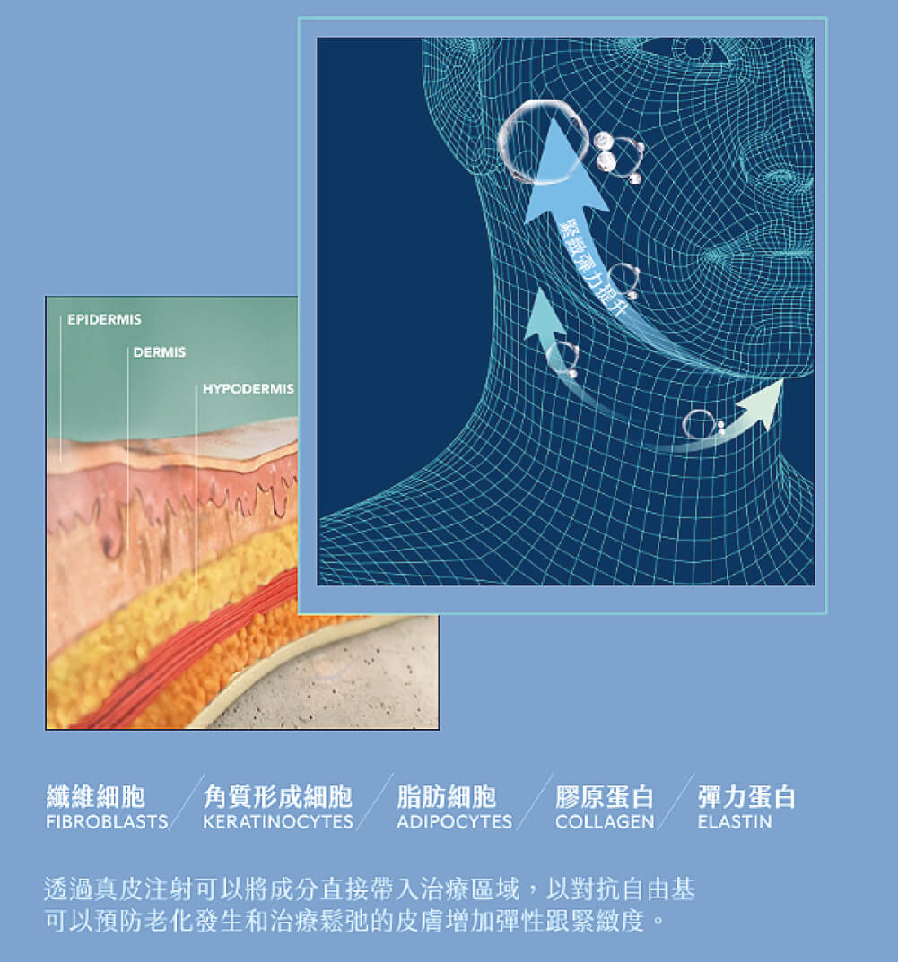 低分子玻尿酸:活化細胞,促進膠原蛋白與彈力蛋白增生。